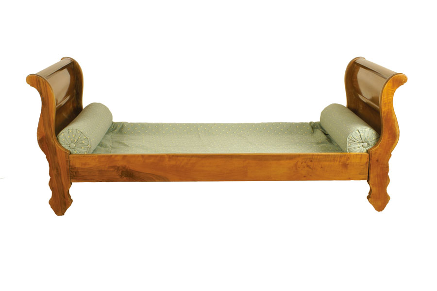 LETTO A BARCA IN NOCE Francia, XX Sec. completo di rete singola, copriletto e due cuscini a cilindro A FRENCH WALNUT BED 20th century Comprising a singel bed, plaid and two cushions 86x227x90 cm.