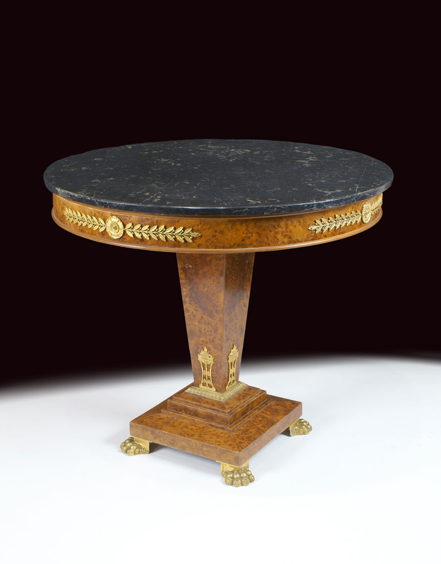 TAVOLO DA CENTRO STILE IMPERO Francia, fine del XIX Sec. in radica, piano circolare in marmo su sostegno a balaustro poggiante su base squadrata, piedi ferini ed applicazioni in bronzo dorato e cesellato A FRENCH ROOTWOOD EMPIRE STYLE TABLE late 19th century Marble top with ormolu applications 78x90 cm.