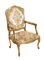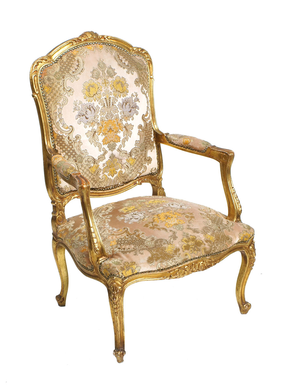 POLTRONA IN LEGNO DORATO XX Sec. ed intagliato a motivi floreali, seduta e schienale rivestiti in tessuto, lievi difetti A GILTWOOD ARMCHAIR 20th century Carved, seating and chair-back upholstered in fabric, minor defects 107x73x62 cm.