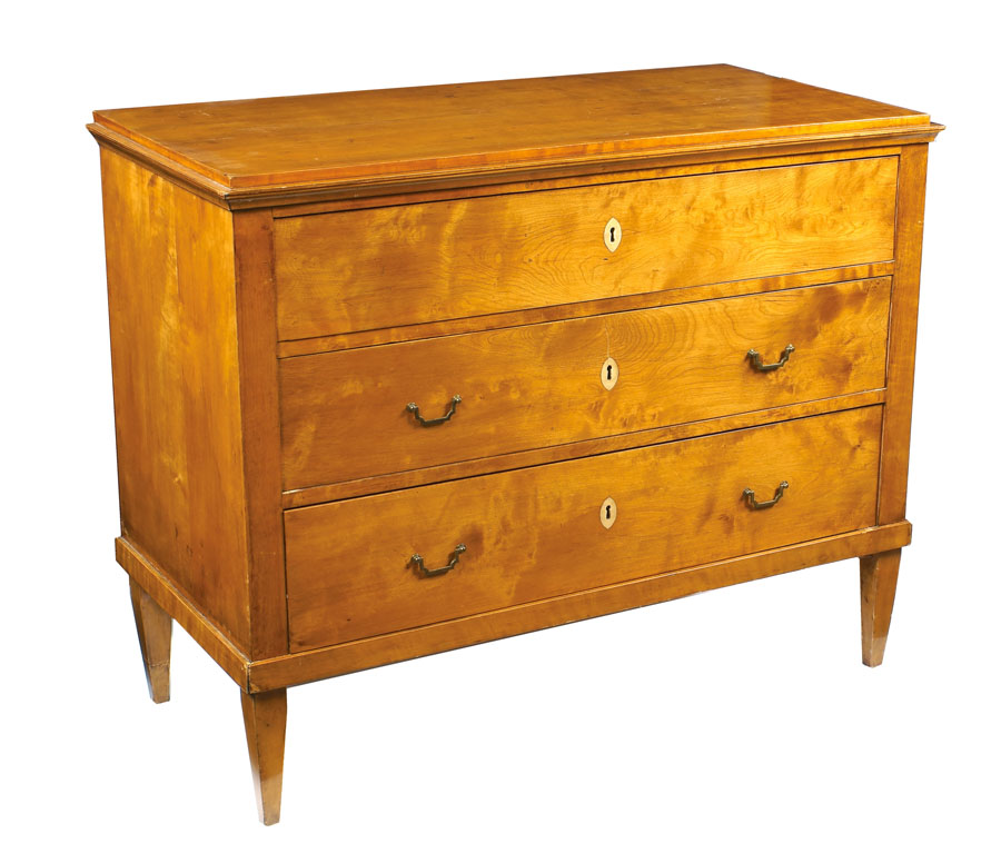 CASSETTONE IN CILIEGIO metà XX Sec. piano rettangolare con tre cassetti sottostanti, piedini troncopiramidali A CHERRYWOOD COMMODE mid-20th century Rectangular top, with three drawers, pyramidal legs 87x108x55 cm.