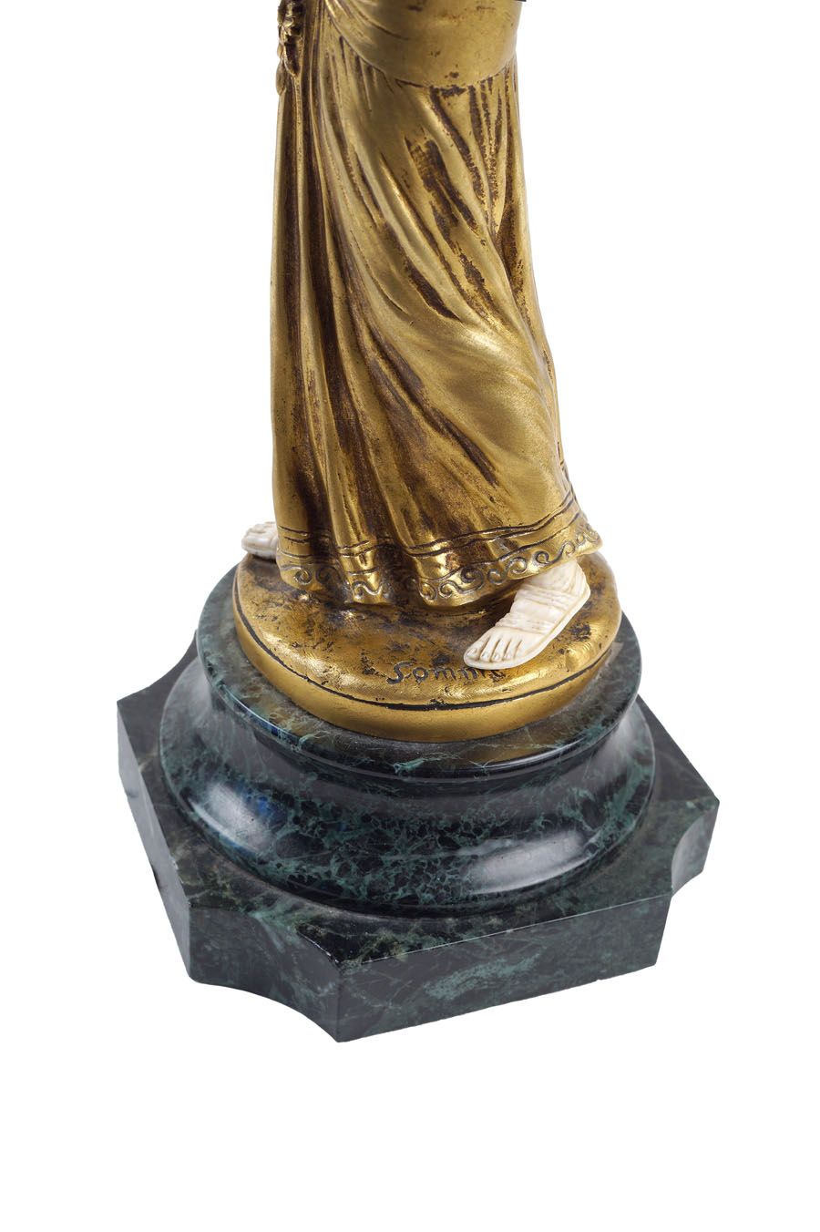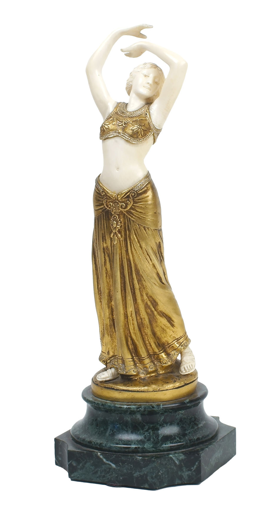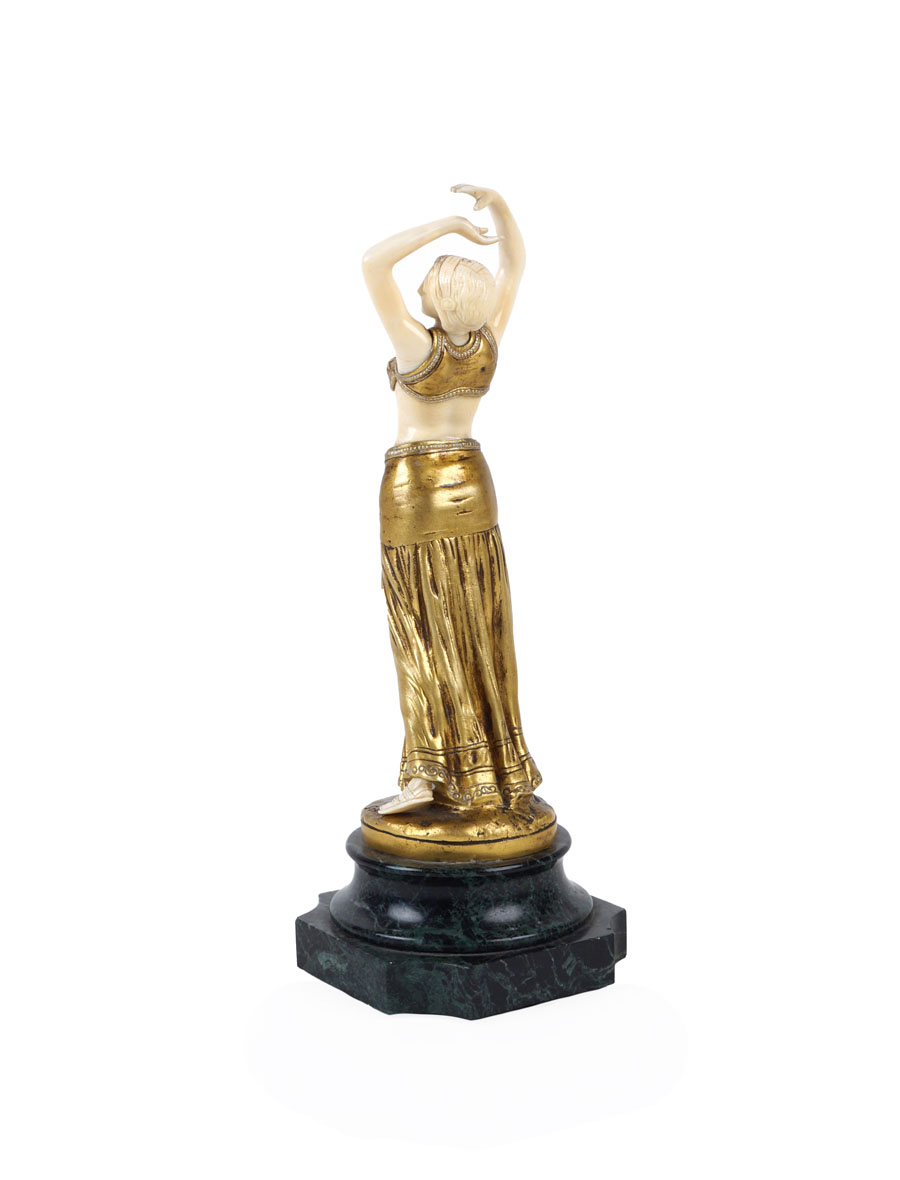 THEOPHILE FRANCOIS SOMME Francia 1871-1952 "Odalisca", scultura crisoelefantina in bronzo e avorio realizzata tra la fine del XIX e l'inizio del XX secolo, firmata , poggiante su base in marmo verde Alpi THEOPHILE FRANCOIS SOMME France 1871 - 1952 "Odalisque", chryselephantine sculpture made of ivory and bronze, signed and on a verde Alpi marble base h. 31 cm.