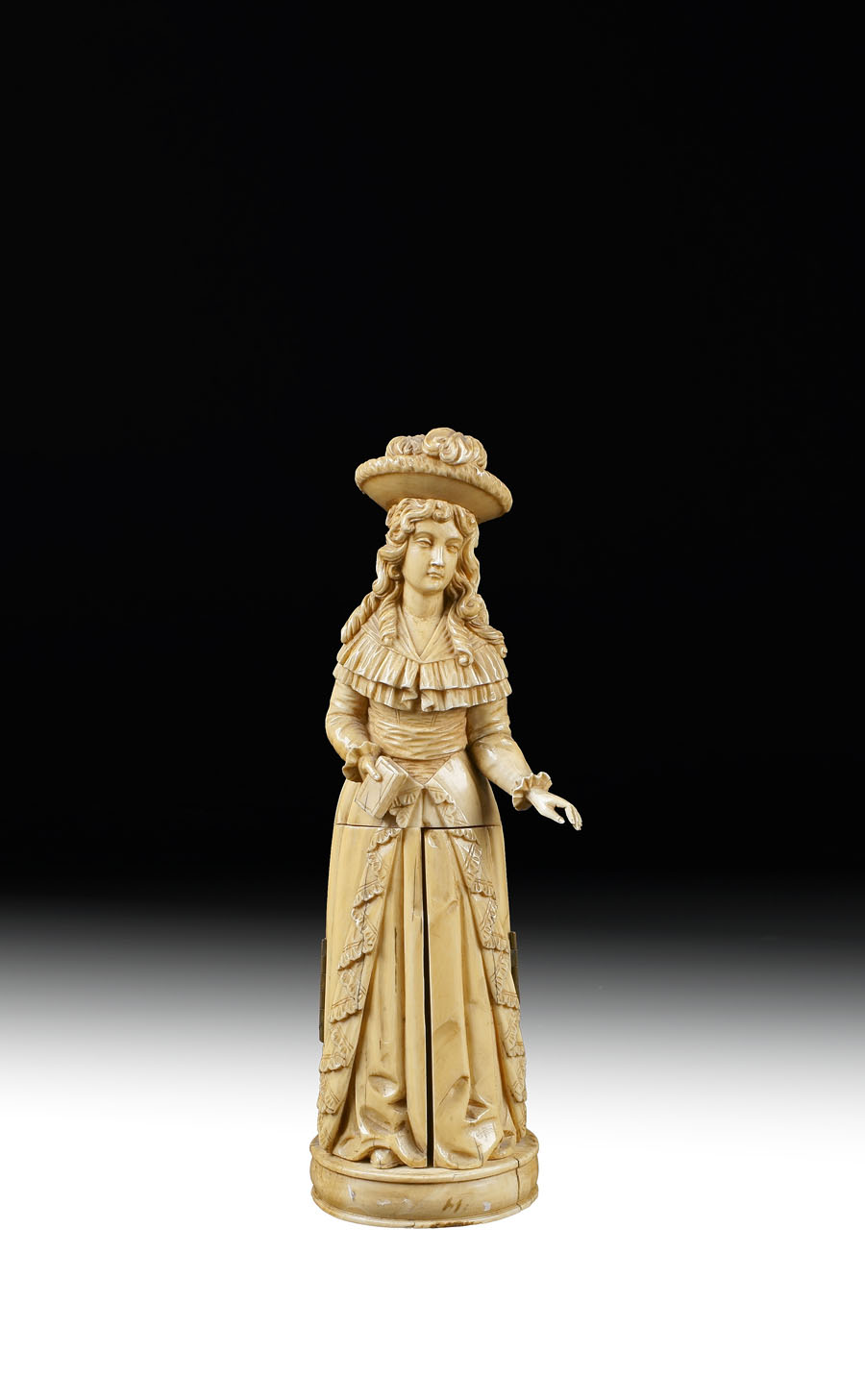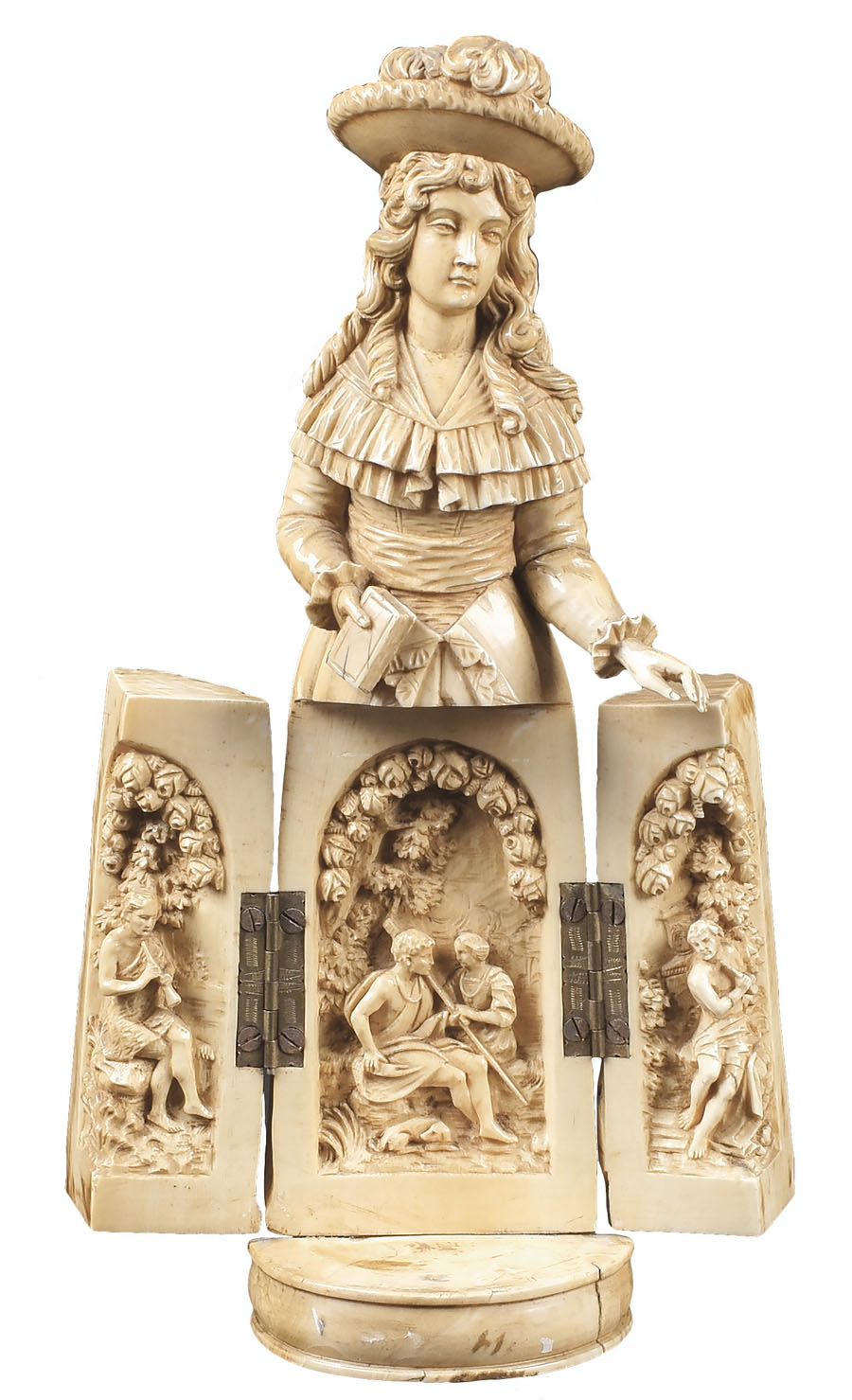 SCULTURA IN AVORIO Francia, fine XVIII inizio XIX Sec. finemente scolpita a raffigurare una figura femminile con veste che cela un trittico a scene bucoliche A FRENCH IVORY SCULPTURE late 18th/early 19th century ivory elaborated attentively and modelled as a feminine figure with bucolic scenes h. 23 cm.