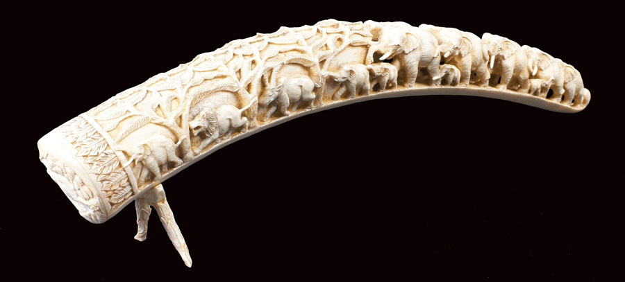 ZANNA IN AVORIO fine XIX Sec. scolpita a motivi di animali vari AN IVORY TUSK late 19th century Decorated with various animals l. 44 cm.
