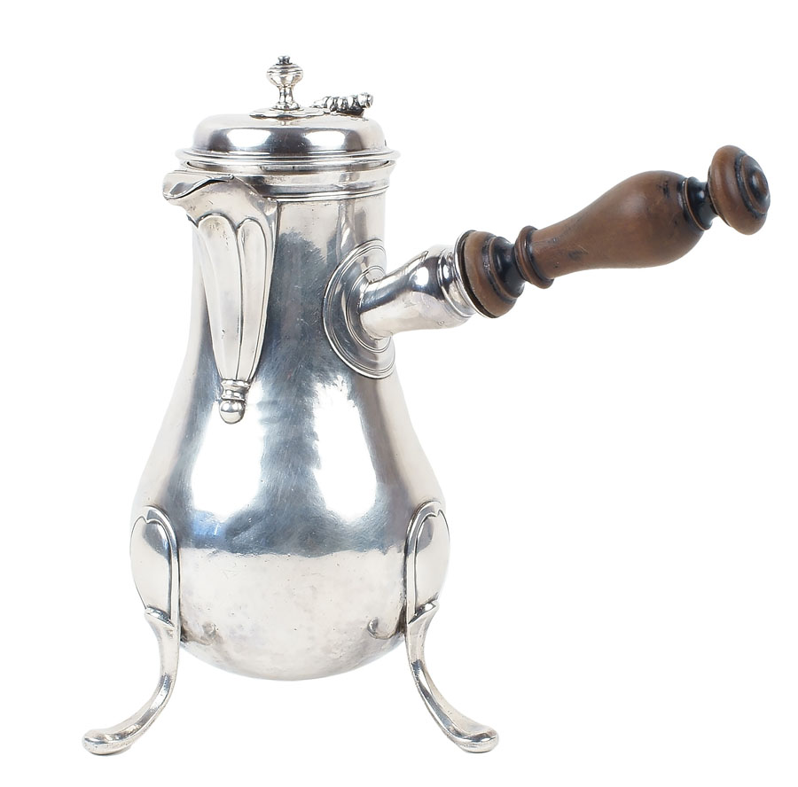 CIOCCOLATIERA IN ARGENTO manifattura nord-europea del XVII Sec. a corpo liscio, poggiante su tre sostegni di linea curva, manico in legno A NORD-EUROPEAN SILVER CHOCOLATE-POT 17th century With wooden handle peso 670 gr.