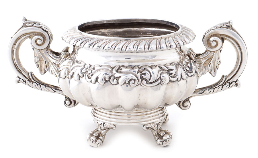 ZUCCHERIERA IN ARGENTO Napoli, 1832-1872 corpo baccellato e sbalzato a motivi floreali, manici a voluta, cm.8x18 AN ITALIAN SILVER SUGAR BOWL Naples 1832-1872 Repousse with floral decorations, scroll-shaped handle, 18 cm diameter peso 434 gr.