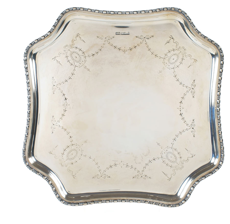 SALVER IN ARGENTO città di Sheffield, 1909 profilo sagomato e godronato, poggiante su quattro piedini a sfera, cm. A SHEFFIELD SILVER SALTCELLAR 1909 beaded borders and on four spheric legs peso 794 gr.