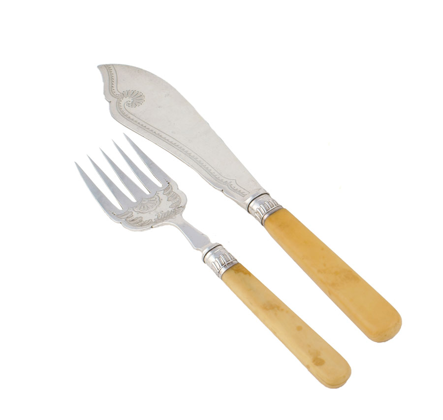 COPPIA DI POSATE DA PESCE IN ARGENTO città di Sheffield, 1897 sbalzate a motivi di volute, manici in osso A PAIR OF SHEFFIELD SILVER FISH FLATWARE SETS Sheffield, 1897 Bone handles