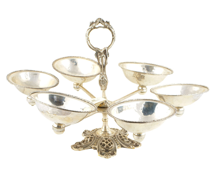 ANTIPASTIERA GIREVOLE IN SHEFFIELD Inghilterra, XX Sec. fusto e base decorata a motivo di volute A SHEFFIELD SILVER "ANTIPASTIERA" England, 20th century Decorated with volute decorations 29x42 cm.