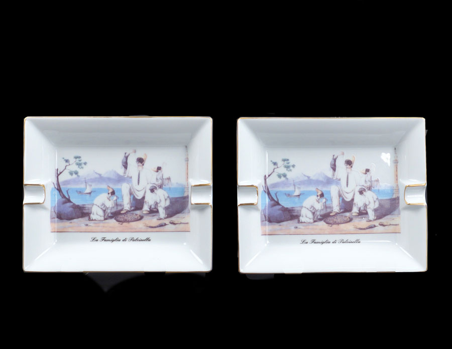 COPPIA DI POSACENERE IN PORCELLANA Capodimonte, XX Sec. A PAIR OF CAPODIMONTE PORCELAIN ASHTRAYS 20th century decorated with scenes of Naples 19x16 cm.