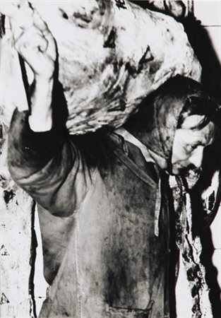 MARIO GIACOMELLI Senigallia (AN) 1925 - Senigallia (AN) 25/11/2000 L'uccisione del maiale, da "Mattatoio", 1960-1961 gelatin silver print (stampa ai sali d'argento) cm. 38,5x27, firma, dicitura Centro Italia e timbro dell'artista al retro, la "serie Mattatoio" è stata realizzata ai macelli comunali di Senigallia. Bibliografia -Germano Celant, "Mario Giacomelli" Photology-Logos, 2001, catalogo ad edizione limitata a 3500 esemplari, illustrazione similare a pagina 246 e seguenti, n° 22-2 e seguenti; -Alessandra Mauro, "Mario Giacomelli - la figura nera aspetta il bianco", Contrasto, 2009, illustrazioni similari a pagina 86-87; -Simona Guerra, "Mario Giacomelli - la mia vita intera", Bruno Mondadori, 2008, pagina 95-96, senza illustrazioni;-Alistair Crawford, "Mario Giacomelli" Contrasto, 2009, illustrazioni similare a pagina 14-15