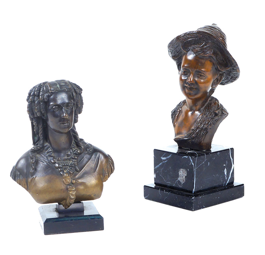 DUE BUSTINI IN BRONZO XIX Sec. soggetti e manifatture diverse A PAIR OF BRONZE BUSTS 19th century Different manufactures h. 24 e 18 cm.