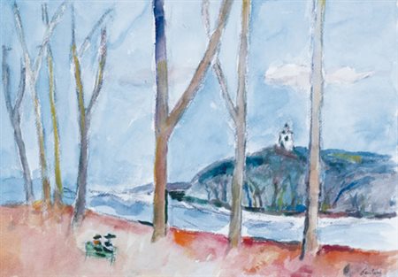 ENRICO PAULUCCI Genova 03/10/1901 - Torino 22/08/1999 Passeggiata Lugo Po e Monte dei Cappuccini, (1980) gouache su carta cm. 35x49,5; firma in basso a destra, opera registrata presso l'Archivio delle Opere di Enrico Paulucci (TO) come da dichiarazione su foto del 2 dicembre 2008.