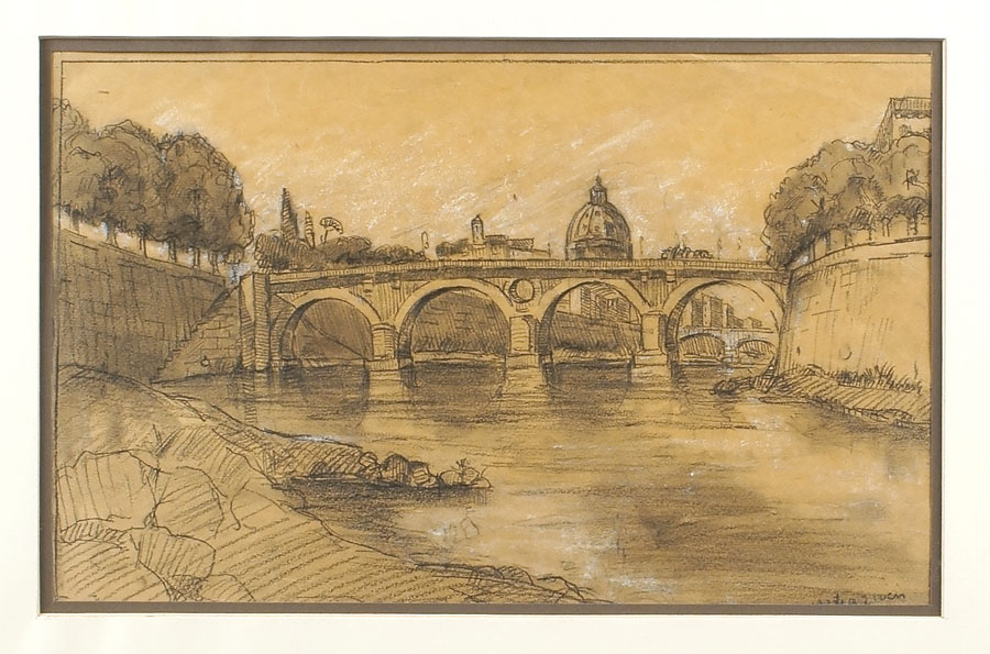 ALBERTO ZIVERI Roma 1908 - 1980 "Lungotevere", disegno a matita, anno 1924, firmato in basso a destra, entro cornice ALBERTO ZIVERI Rome 1908 - 1980 "View on the Tiber", pencil drawing, signed and dated 1924 (lower right), framed 35x22 cm.