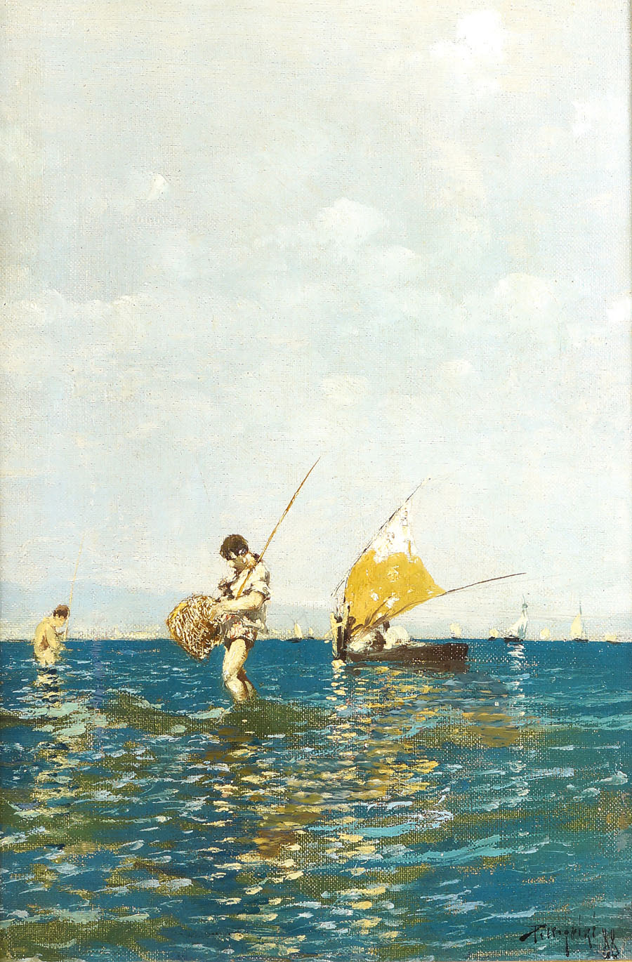 RICCARDO PELLEGRINI, ATTRIBUITO inizio XX Sec. "La pesca", olio su tela, firmato in basso a destra, entro cornice ATTRIBUTED TO RICCARDO PELLEGRINI early 20th century "Fishing", oil on canvas, signed (lower right), framed 38x25 cm.