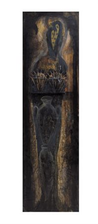 BRUNO CECCOBELLI Montecastello Vibio (Pg) 02/09/1952 Ricca ricolma, 1988 tecnica mista e applicazioni su tavola cm. 173,5x50,5; firma, titolo e anno al retro, dichiarazione d'autenticità dell'artista con anno 1987 e titolo "Incontravasi" su foto.