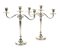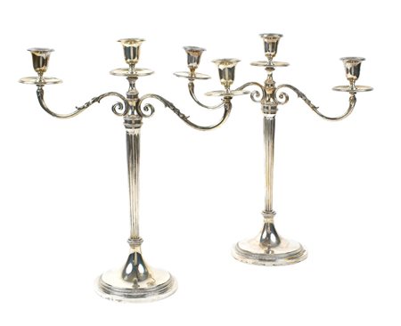 COPPIA DI CANDELABRI IN ARGENTO A TRE FIAMME Italia, XX Sec. fusto scanalato...