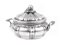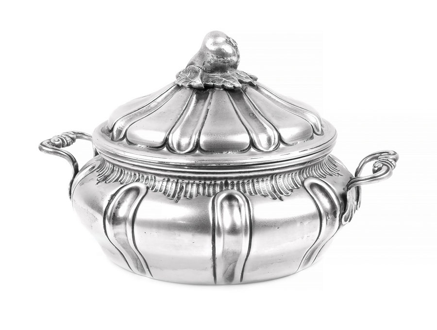 PICCOLA LEGUMIERA IN ARGENTO Italia, metà XX Sec. di forma circolare a due manici, corpo baccellato e coperchio con presa a foggia di pera, cm.14x23x19 AN ITALIAN SILVER TUREEN mid-20th century circular shaped and with cover with pear shaped handle 730 gr.
