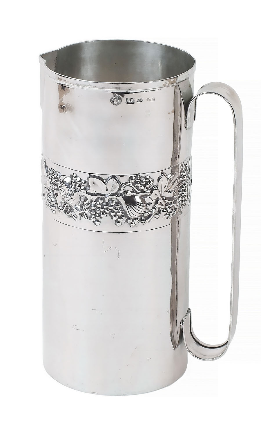 CARAFFA IN ARGENTO BRANDIMARTE Firenze, XX Sec. corpo liscio con fascia sbalzata a motivi di tralci di vite e grappoli d'uva, h. cm. 22 A BRANDIMARTE SILVER DECANTER Florance, 20th century plain silver with vine branch decorations, height 22 cm. peso 510 gr.