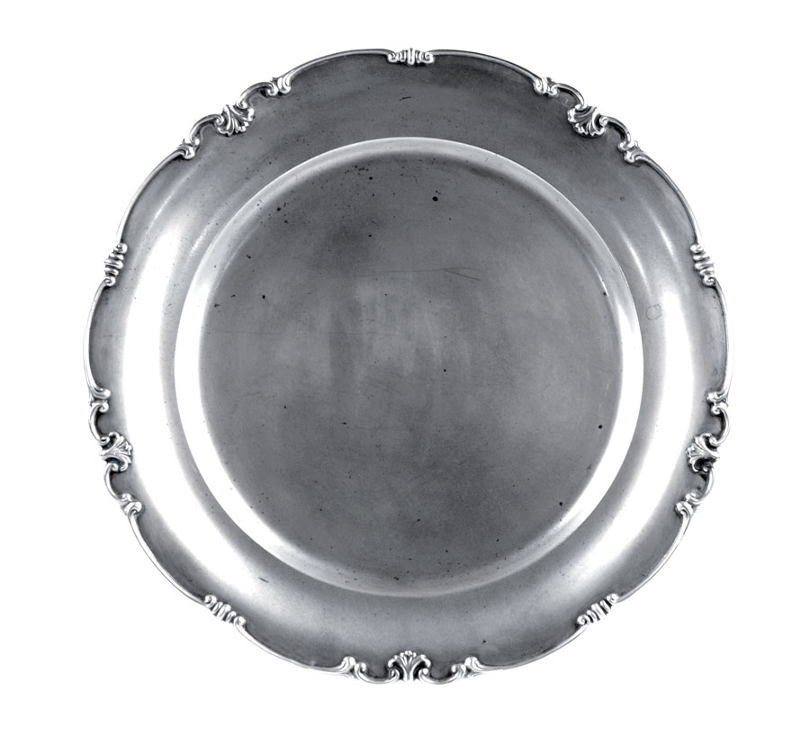 VASSOIO CIRCOLARE IN ARGENTO Italia, XX Sec. profilo sbalzato, d. cm. 29 AN ITALIAN SILVER TRAY 20th century scroll border and repoussé decorations peso 515 gr.