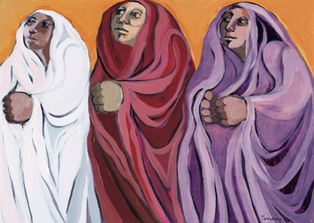 SAVERIO TERRUSO Monreale (Pa) 11/01/1939 - Milano 03/03/2003 Oranti, anni '70 olio su tavola cm. 50x70, firma in basso a destra, titolo, firma e archivio dell'artista numero A/54 al retro, archivio numero AS023D6 a cura della Satena (MI) su foto.