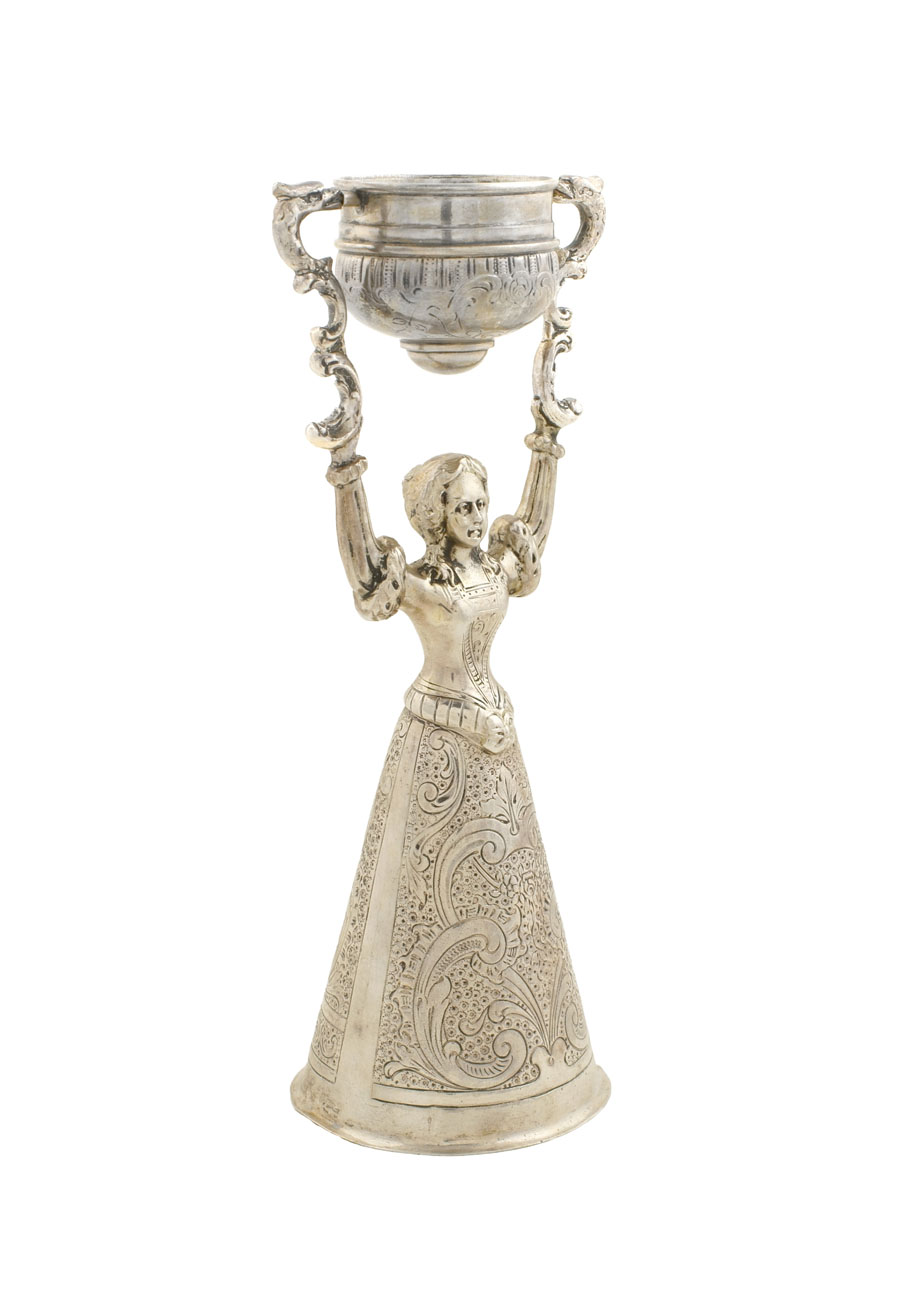 COPPA DELL'AMORE IN ARGENTO Germania, XIX Sec. finemente incisa a motivi vegetali e di volute, h. cm. 20 A SILVER GERMAN MARRIAGE CUP 19th century fine engravings, height 20 cm. peso 200 gr.