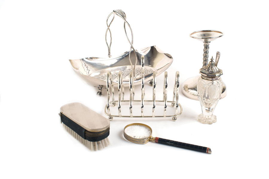 SEI OGGETTI IN METALLO ARGENTATO fogge e manifatture diverse A MIXED SILVERED...