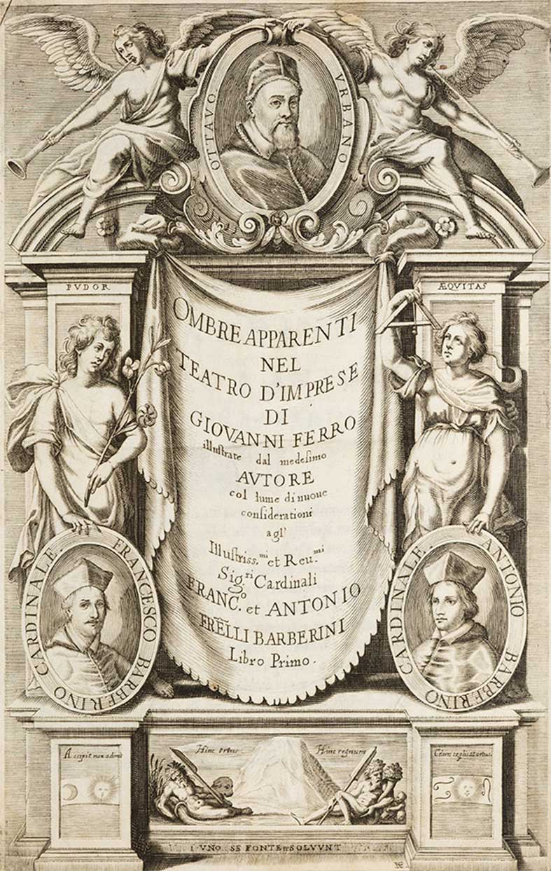 Ferro, Giovanni Ombre apparenti nel teatro d'imprese Venezia, Giacomo Sarzina, 1629. In 2°. 2 libri in 1 volume. Due frontespizi architettonici figurati incisi in rame, testatine e capilettera xilografici decorati, occhiello con rinforzo al margine interno, piccoli risarcimenti ad alcune carte, legatura del sec. XVIII in pergamena, al dorso a 4 nervi tassello in marocchino rosso con autore e titolo in oro, qualche macchia. Rara prima edizione di quest’opera sull'Impresa, variante aristocratica dell'emblema. La simbolica delle imprese divenne oggetto di studio di letterati ed ecclesiastici a partire dalla metà del Cinquecento. In queste Ombre apparenti l'abate risponde polemicamente al vescovo di Tortona, Paolo Aresi, che aveva criticato la sua precedente opera sul teatro d'imprese, asserendo di averci trovato delle "ombre". Praz 336, Michel III, 38.