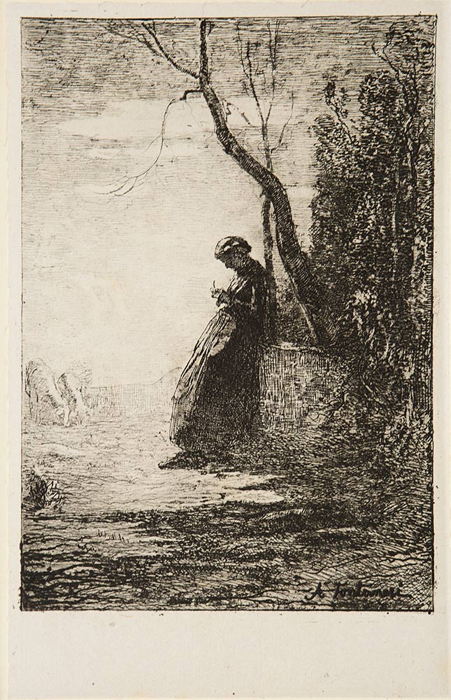 Fontanesi, Antonio Nove acqueforti, tirate di sui rami originali esistenti presso il civico Museo d'arte moderna di Torino Torino, Fratelli Ribet, 1929. In 2°. Cartella con frontespizio con titolo stampato in rosso, 9 acqueforti stampate su carta cina applicate su supporto di cartoncino avorio, mm. da 135 x 170 x a 220 x 140, alcune firmate in lastra e numerate a matita, legatura in pergamena, al piatto anteriore autore e titolo impressi in oro, bindelle in cuoio, bruniture. Opera in tiratura limitata a 75 esemplari numerati, il nostro è il numero 32. Le tavole contenute nell’opera sono: Sole di primavera / Idilio / Ranocchi / Nel pollaio / Mucche / Alla fonte / Pascolo / Sera / Il lavoro.