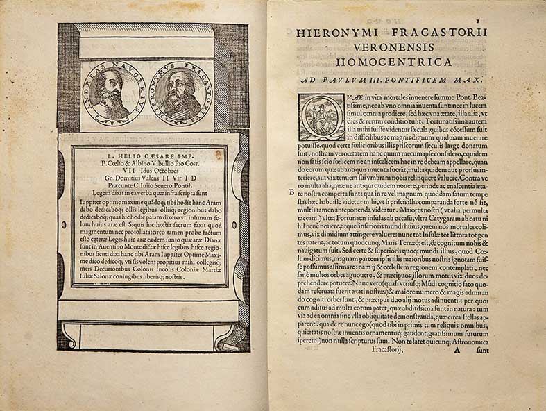 Fracastoro, Girolamo Opera omnia, in unum proxime post illius mortem collecta Venezia, Giunta, 1555. In 4°. Marca tipografica al frontespizio, ritratto dei due autori e diagrammi incisi in legno nel testo, restauro al margine inferiore bianco del frontespizio, legatura in pergamena rigida del sec.XIX. Prima edizione dell’opera omnia, uscita postuma. Girolamo Fracastoro (Verona, 1476-1478 ca., Affi, 6 agosto 1553) è stato un medico, filosofo, astronomo, geografo e letterato italiano. Collega e amico di Niccolò Copernico, Fracastoro fu anche professore di logica all'Università di Padova. Fu archiatra di papa Paolo III, al quale dedicò l'opera astronomica Homocentrica (1538). A lui è dedicato il cratere lunare Fracastoro. È uno dei fondatori della moderna patologia. Come astronomo fu il primo a scoprire, con Pietro Apiano, che le code cometarie si presentano sempre lungo la direzione del Sole, ma in verso opposto ad esso. Nel 1538 descrisse uno strumento in funzione astronomica, poi realizzato da Galileo Galilei decine di anni dopo: il cannocchiale. Adams F, 817; Durling 1631; Wellcome I, 2396; Houzeau-L. 2455; Baumgartner-Fulton 32.