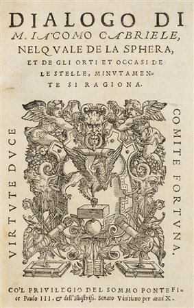 Gabriele, Giacomo Dialogo […] nel quale de la sphera, et de gli orti et occasi de le stelle, minutamente si ragiona Venezia, Giovanni Griffio, Giovanni Farri e fratelli, 1545. In 4°. Marca tipografica al frontespizio, restauri ai margini interni delle prime carte, leggera brunitura al margine superiore delle prime carte, ultima carta bianca mancante, legatura in pergamena del secolo XX. Prima edizione. Gli interlocutori del dialogo discutono il valore delle antiche teorie astrologiche rispetto alle ricerche moderne di astronomia.L'opera si configura come un trattato dove astronomia, astrologia, teologia e filosofia si fondono, componendo insieme il pensiero esoterico rinascimentale e l'inedita visione del mondo prodotta dalle nuove osservazioni scientifiche. Riccardi I, 497.