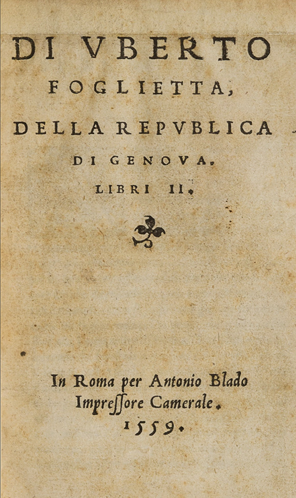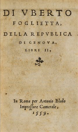 Genova - Foglietta, Uberto Di Uberto Foglietta, Della republica di Genova, libri II Roma, Antonio Blado, 1559. In 8°. Qualche brunitura, abile restauro al margine superiore bianco del frontespizio, legatura del secolo XVII in pieno vitellino spugnato con cornice decorata a secco ed in oro ai piatti, tagli a spruzzo rosso, dorso rifatto. Ex libris Chatsworth. Prima edizione. Scritta in forma di dialogo, l'opera dello storico ligure denunciò gli abusi della vecchia nobiltà di Genova: ciò gli procurò una vasta notorietà e il bando da quella Repubblica. Bitossi: "il solo testo del dibattito politico genovese del Cinque-Seicento a conoscere la via della stampa, associava i temi dell'indipendenza e del riarmo navale della Repubblica, immaginava per Genova una prospettiva di lucroso mercenariato marinaro, era animato da una visione antinobiliare della storia genovese, proponeva una riforma censitaria del sistema politico" Bitossi, D.B.I., Vol. 48, 1997.