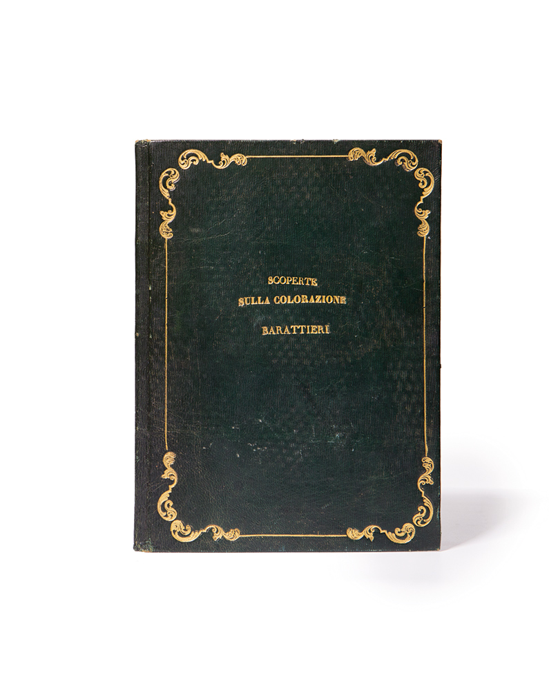 Barattieri, Carlo Scoperte sul gran fenomeno della Colorazione Piacenza, Giuseppe Tedeschi, 1797. In 4° piccolo. Vignetta al frontespizio, testatine e finalini xilografici, 2 tavole ripiegate in fine volume, legatura in marocchino verde del sec. XIX, piatti inquadrati da cornice impressa in oro, al centro del piatto anteriore titolo ed autore ed a quello posteriore placca impressa in oro. Rara edizione. Il Barattieri riprende le argomentazioni espresse nella memoria del 1793 sulla natura del colore e della luce; riferisce le esperienze da lui compiute sulle "alterazioni che soffrono i cinque colori più distinti dello spettro Newtoniano" attraverso la rifrazione e illustra gli esperimenti nelle due tavole poste in fine. Poggendorff, I, col. 97.