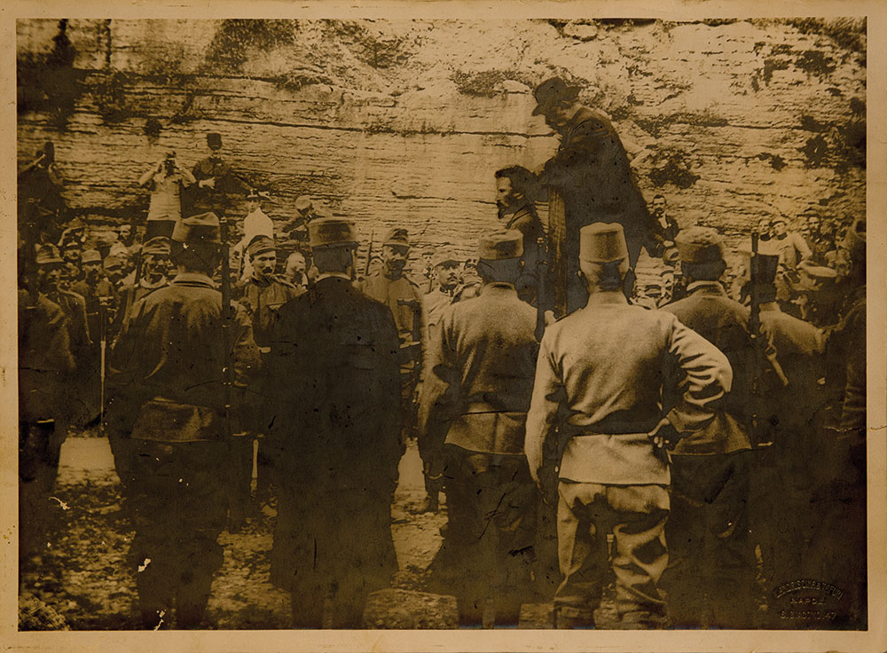 Battisti, Cesare Fotografia Stampa ai sali alla gelatina ed ai sali d’argento, mm. 300 x 420, timbro della “Landriscina & Tafuri/ Napoli/ S.Giacomo.47” al recto ed al verso, nota manoscritta “da negativo autentico; avuto [...] in Trento da un ufficiale austriaco”, strappo al margine esterno destro, forte specchio d’argento in corrispondenza dei neri. La fotografia ritrae Cesare Battisti nel momento della sua impiccagione per mano del boia austriaco Lang il 12 luglio 1916 nel Castello del Buon Consiglio a Trento.