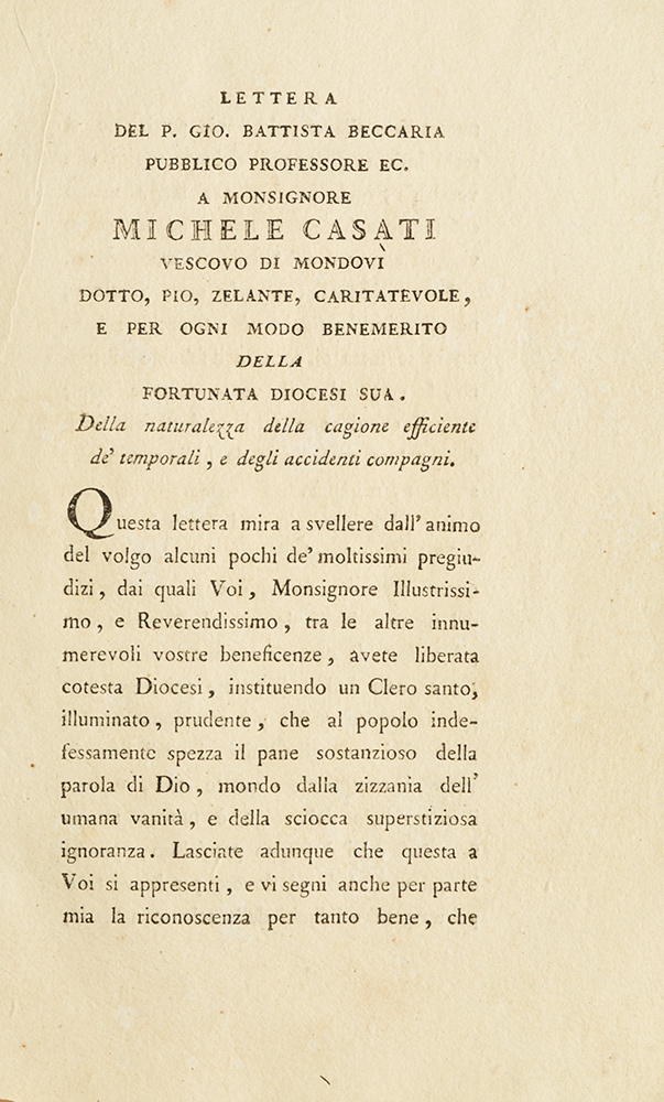 Beccaria, Giambattista Al Signor Conte Cotti di Brusasco per la laurea in ambe leggi applaudendo il P. G. B: Beccaria pubblica una sua Lettera, nella quale si trova d'aver soddisfatto ad un'antica quistione... intorno alla naturalezza della cagione efficiente de' Temporali e de' fenomeni compagni Torino, G. Briolo, s.d. [1781]. In 8°. Impresso su carta avana, brossura originale in carta marmorizzata. Opuscolo raro, che costituisce l'ultima pubblicazione a stampa del Beccaria prima della morte [27 maggio 1781]; il grande fisico piemontese negli ultimi anni della sua vita, compiute le opere maggiori, diede ancora piccoli ma significativi contributi scientifici in forma epistolare, inseriti soprattutto in pubblicazioni di carattere gratulatorio come la presente. Qui indaga sulle cause dei temporali, sfatando le credenze che siano fattucchieri e spiriti maligni a provocarli, e conferma la natura elettrica del fenomeno dei fuochi di S. Elmo. Eandi, Memorie storiche del p. Beccaria, p. 110 e p. 158 n. 49; Rossetti & Cantoni, p.15.