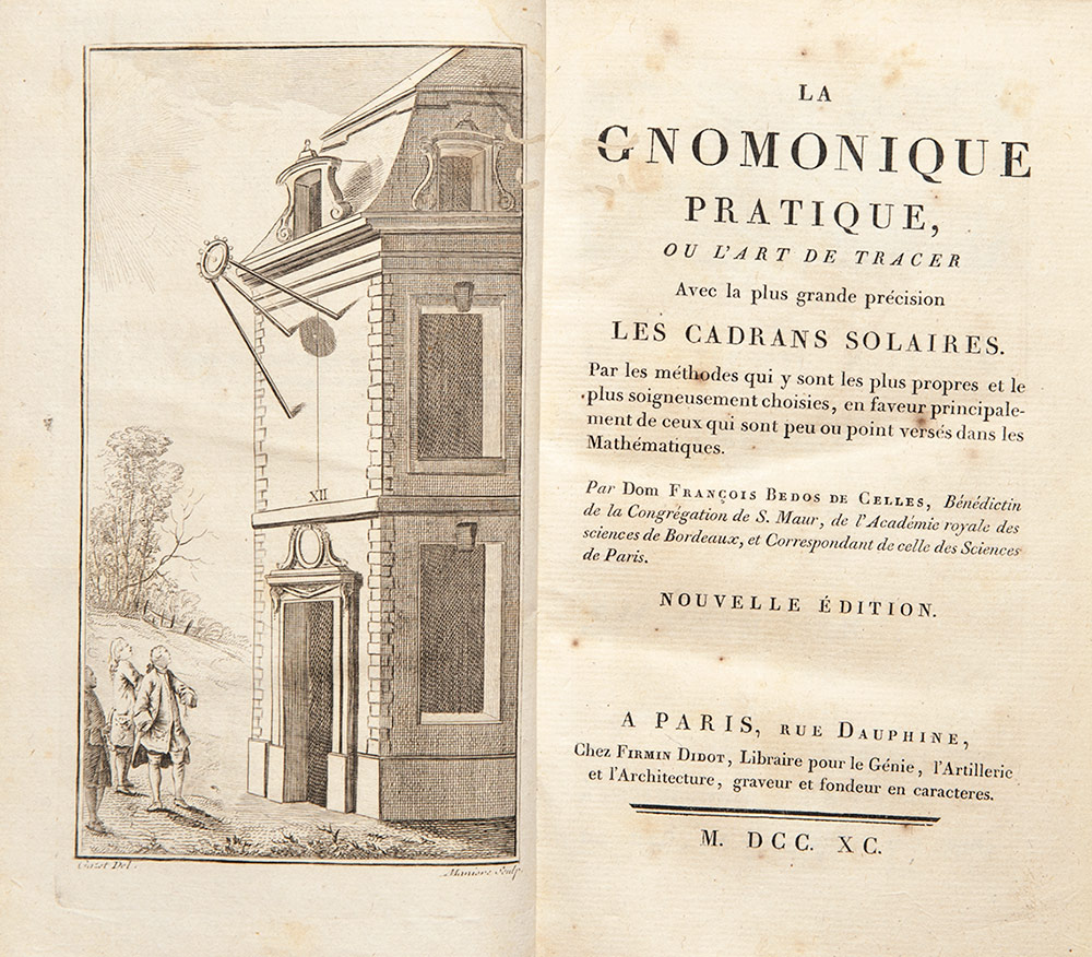 Bédos de Celles, Dom François Lamathe La Gnomonique pratique, ou lart de tracer avec la plus grande précision les cadrans solaires par les méthodes qui y sont propres Parigi, Chez Firmin Didot, 1790. In 8°. 198 x 125 mm. Antiporta figurata incisa da Maniere, 38 tavv. fuori testo incise in rame, tutte ripiegate, con parti di orologi e grafici per effettuare gli orologi solari, grande tavola più volte ripiegata con la Carte de France suivant les operations geometriques de mm. de l'Acad. Royale des Sciences. par R. Bonne. Pregevole opera, suddivisa in 13 capitoli: Notions préliminaires; Instrumens nécessaires à la construction des cadrans solaires; Explication des calculs dont on se servira dans ce traité de gnomonique; Cadran horisontal; Des ca-drans qu'on appelle réguliers; Cadrans verticaux déclinans; Cadrans verticaux sans centre; Cadrans inclinés; Méridiennes; Cadrans portatifs; Observations sur la maniere de régler les horologes; Principaux usages ducompas de proportion concernant la gnomonique; 13.Devises pour les cadrans solaires. Al termine: "Extrait des registres de l'Académie Royale des Sciences".