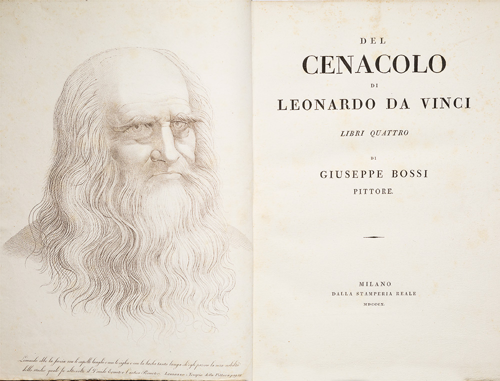 Bossi, Giuseppe Del Cenacolo di Leonardo da Vinci Milano, Stamperia Reale, 1810. In 2°. Occhiello, tavola con ritratto, 6 tavole incise in rame fuori testo, in totale 7 tavole incise in rame fuori testo, legatura coeva in pergamena e tela zigrinata, alcune lievi arrossature. Edizione originale figurata. Importantissima fonte dell'arte che analizza con rigore e completezza il celebre affresco milanese. Artista poliedrico e raffinato collezionista, Bossi (1777-1815) dopo aver fatto una replica del Cenacolo per Eugène de Beauharnais, redasse quest'opera monumentale in cui documenta ogni sfaccettatura del dipinto, registrando dettagliatamente anche gli interventi di "riparazione" cui l'affresco era stato sottoposto nel corso del tempo. Il libro divenne un'opera di riferimento per i viaggiatori europei e contribuì a fare della visita al Cenacolo una tappa obbligata del Gran Tour, sia Stendhal che Goethe ne possedevano una copia, da entrambi annotata con cura. Pietro Marini, Leonardo: L'Ultima Cena, p. 27; M. Guerrini, Bibliotheca Leonardiana 1493-1989, vol. I, 1990, p. 197.