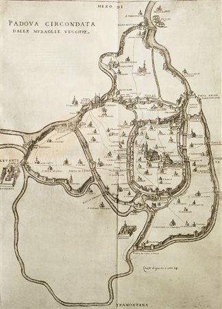 Padova - Portenari, Angelo Della felicità di Padova Padova, Tozzi, 1623. In 2°. Frontespizio architettonico inciso in rame, 9 xilografie nel testo di cui una a piena pagina, 3 tavole ripiegate fuori testo incise in rame, alcuni rinforzi al verso delle tavole, alone marginale alle prime carte con piccolo rinforzo al margine, qualche fioritura, legatura del sec. XVIII in mezza pergamena, titoli in oro su tassello al dorso, tagli a spruzzo. Rara edizione originale illustrata. Importantissima fonte di storia della città di Padova, corredata da notevoli illustrazioni. Lo splendido Frontespizio inciso in rame reca il titolo entro edicola architettonica con figure allegoriche ai lati, nella predella le allegorie dei fiumi Bacchiglione e Brenta; le tavole più volte ripiegate raffigurano il Carroccio padovano, firmato da P. P. Tozzi, Padova circondata dalle muraglie vecchie e Padova circondata dalle muraglie nuove. Una grande xilografia nel testo raffigura la Basilica del Santo, le altre, fra cui una a piena pagina, illustrano antiche macchine belliche, fra cui un "gatto" per l'assedio; un'ulteriore piccola incisione a pagina 97, delinea la pianta romboidale del Palazzo della Ragione.