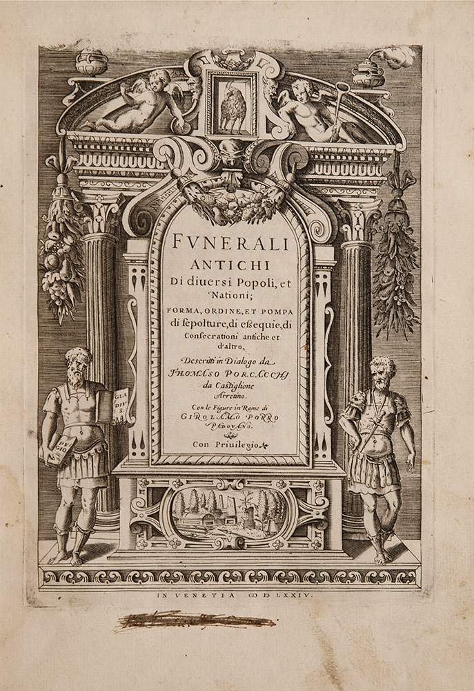 Porcacchi, Tommaso Funerali antichi, di diversi Popoli et Nationi Venezia, Simone Galignani, 1574. In 2°. Elaborato frontespizio architettonico calcografico, 23 immagini a mezza pagina incise su rame opera di Girolamo Porro, grande marca tipografica in xilografia al recto dell'ultimo foglio, finalini, grotteschi e capilettera xilografati, legatura coeva in pergamena floscia, difetti al dorso. Al frontespizio nome di antico possessore cancellato con un leggero tratto di penna sul margine inferiore bianco a penna. PRIMA EDIZIONE dell'opera di Porcacchi, illustrata dalle splendide incisioni su rame di Girolamo Porro che, poste in apertura a ciascun capitolo, riproducono scene di cerimonie funebri secondo l'antico uso di diversi popoli, dai Romani agli "Egittii" e agli "Scithi".