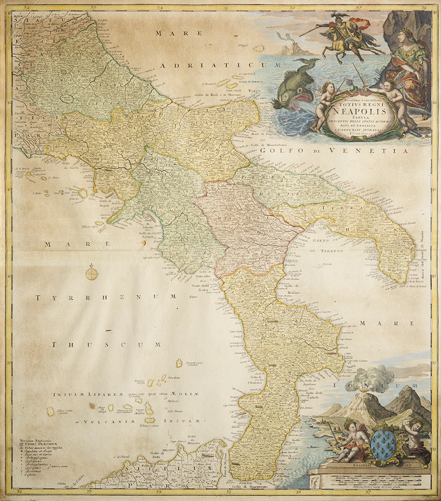 Puglia & Campania - De Rossi, Domenico Provincia di Terra d'Otranto già delineata dal Magini e nuovamente ampliata secondo lo stato presente Incisione originale su rame, Roma, 1714, confini e l’elaborato cartiglio con titolo colorati da mano coeva, aloni di umidità, piccoli difetti lungo la piegatura centrale, mm. 467 x 566, in cornice di legno moderna. § Provincie di Basilicata e Terra di Bari. Roma 1714, mm. 450 x 600. Medesima descrizione della carta precedente. § Johann Baptist Homann. Novissima & exactissima Totius Regni Neapolis. Incisione su rame, Norimberga, c.ca 1720, titolo contenuto in elegante cartiglio figurato, in basso a destra vedutina di Napoli, coloritura d’epoca, brunitura leggera, mm. 565 x 490 il foglio, in cornice moderna in legno. Carte geografiche rare del territorio della Puglia tratte dal Mercurio Geografico edito dallo stesso De Rossi a Roma tra il 1670 ed il 1720. Dal punto di vista cartografico derivano dal Magini ma aggiornate nella toponomastica.