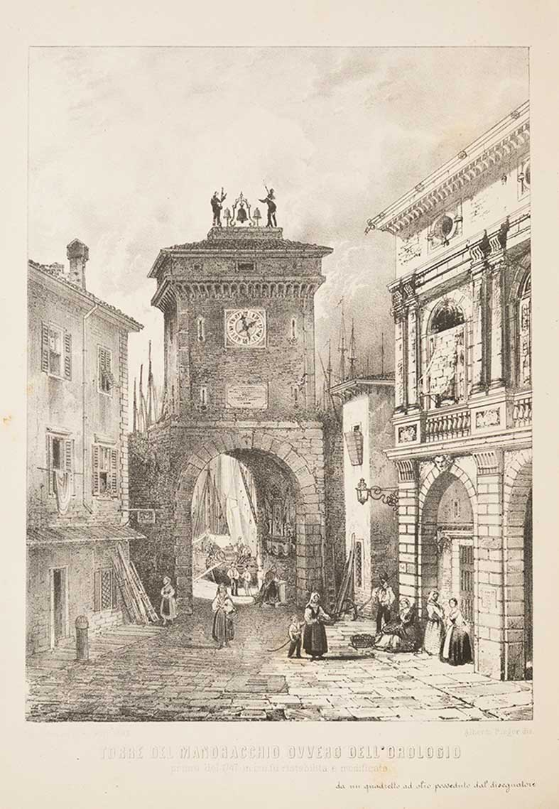 Trieste - Scussa, Vincenzo Storia cronografica di Trieste Trieste, C. Coen, 1863. In 2°. Illustrata con numerose tavole litografate da Colombo Coen su disegni di Rieger, Kirchmayr, Gatteri e Marangon, arrossature sparse, legatura editoriale in cartonato arancione, titolo stampato al piatto anteriore, gora d’acqua al dorso, sciupata. Edizione originale di quest’opera che raccoglie moltissime notizie su Trieste, sulla storia civile e politica, i miti e la religione, l'arte, l'architettura, le fortificazioni, la monetazione, le caratteristiche corografiche del territorio. L'edizione fu curata da Francesco Cameroni che si avvalse dei manoscritti conservati nell'archivio di Trieste: oltre alla storia di Vincenzo Scussa, che giunge sino al 1695, sono pubblicati gli annali di Pietro Kandler, dal 1695 al 1848.