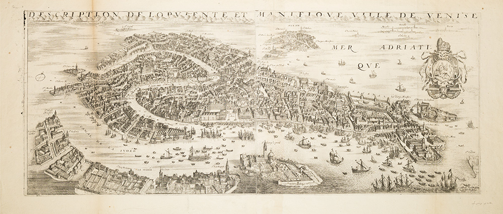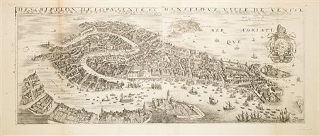 Venezia - Boisseau, Jean Description de lopulente et manifique ville de Venise Incisione su rame, Parigi, 1646, in basso a destra: “A Paris, chez J. Boisseau en Isle du Palais”, rinforzo lungo la piegatura laterale, mm. 275 x 695. Rarissima pianta panoramica di Venezia, che delinea anche le isole di Murano, Burano, Torcello e Mazorbo. La mappa, che riprende quella del Merian, fu pubblicata dal geografo e topografo francese. Nata come foglio volante, fu poi inserita nell'opera Théâtre des Citez, una delle più rare collezioni francesi di vedute. Le tavole furono intagliate da H. Picart, che lavorò dal 1641 al 1648, realizzando in totale 28 vedute di città francesi e 28 di altre città europee e dell'Asia.1646