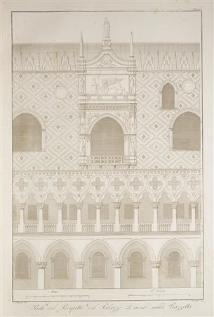 Venezia - Cicognara, Leopoldo Le Fabbriche e i Monumenti Cospicui di Venezia Venezia, Giuseppe Antonelli, 1856. In 2°. 2 voll. Due frontespizi con vignetta calcografica, con un totale di 259 tavole litografiche (1 - 127 al primo volume e 128 - 259 al secondo), fioriture, legatura originale in mezza pelle, titolo impresso in oro al dorso liscio, difetti. Seconda edizione rara di questa monumentale opera curata dal Cicognara insieme ad Antonio Diedo e Giannantonio Selva.