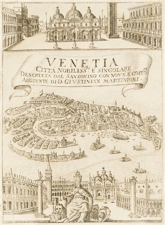Venezia - Sansovino, Francesco Venetia citta' nobilissima et singolare, descritta in xiiii. libri Venezia, Stefano Curti, 1663. In 4°. Antiporta calcografica con veduta prospettica a volo d'uccello di Venezia e due vedute di Piazza S. Marco, ritratto del Martinioni inciso in rame fuori testo, qualche macchia, brunitura leggera, legatura coeva in cartonato, dorso in parte staccato. Pregevole edizione secentesca di questa celebre illustrazione storico-artistica di Venezia. Tratta delle chiese, fabbriche, edifici, palazzi pubblici e privati, degli usi e costumi antichi e moderni, e dei fatti istorici accorsi a Venezia. Cicognara: "Questa e la migliore illustrazione di Venezia non senza errori, ma almeno desunta da buone fonti...". Cicogna: "...Nel Martinioni poi riescono di utilita i cataloghi posti alla fine, cioe degli uomini letterati, dei medici, degli avvocati, dei pittori, degli scultori". Curiosa e la descrizione dello "studio" di Sigmondo Alberghetti, corrispondente di Galileo, con la sfera copernicana e quella tolemaica da lui costruite. Cicognara 4380; Cicogna 4467.