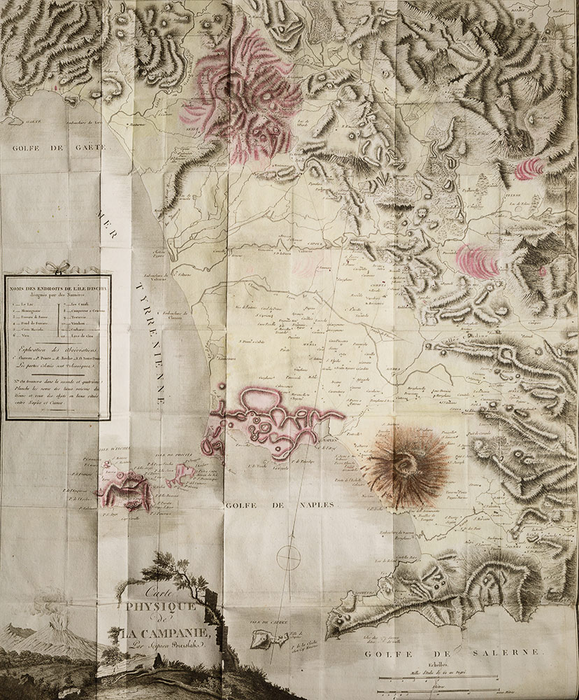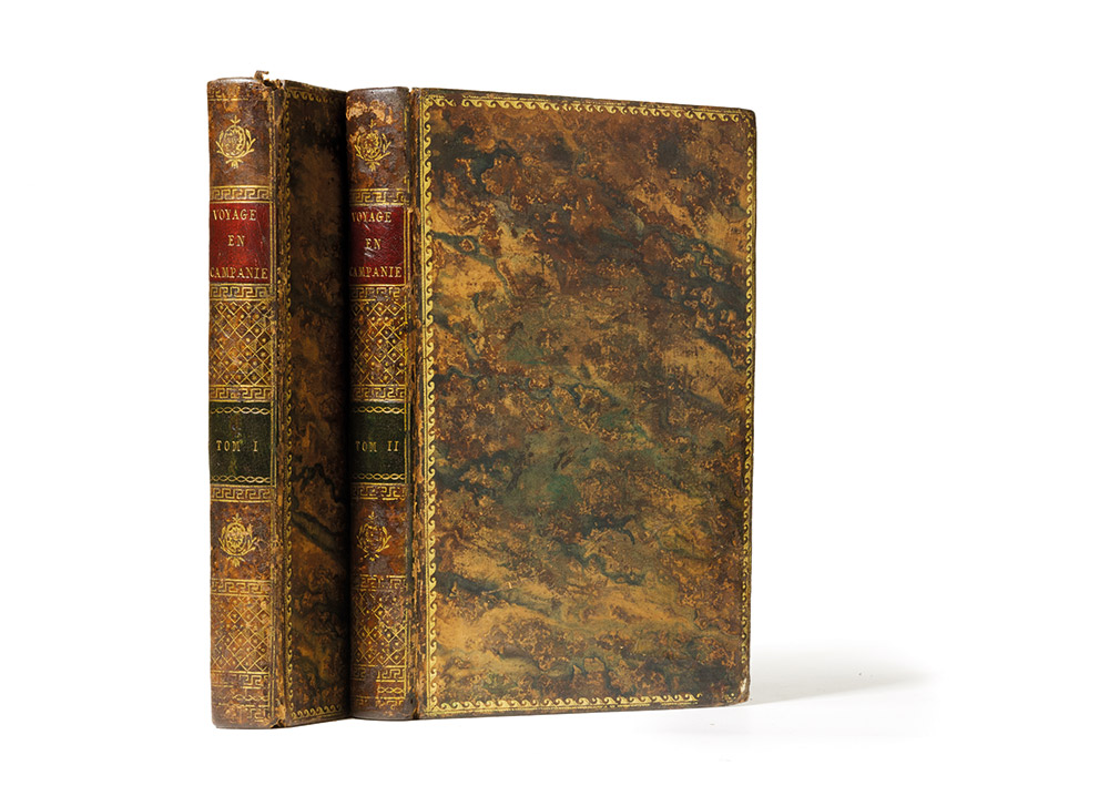 Vulcanologia - Campania & Lazio - Breislak Scipion Voyages physiques et lythologiques dans la Campanie; suivis d'un mémoire sur la Constitution physique de Rome Paris, Dentu, an IX [1801]. In 8°. 2 voll. 6 tavole fuori testo, legatura in vitello marmorizzato, riquadro in oro ai piatti, dorso riccamente ornato in oro con doppio tassello rosso e verde per i titoli, tagli marmorizzati. La migliore edizione di questo fondamentale studio sulla costituzione geologica e vulcanologica della Campania e del territorio romano. L'opera era già apparsa in una edizione ridotta, non illustrata e assai scorretta ["fourmillant d'erreurs", Prefaz., p. IV] come Topografia fisica della Campania. Tra le 6 tavv. inc. in rame, sono da notare: la bellissima Carte physique de la Campanie [cm. 70 x 58], in coloritura coeva all'acquarello; la Carte des Cratéres eteints entre Naples et Cumes [cm. 38 x 47]; e il Plan physique de la ville de Rome [cm. 38 x 32]. "This work... is in many respects supplementary to Spallanzani's Travels. Breislak also contributed the first researches on the geology and stratigraphy of Rome and of the part of the Apennines which surrounds the volcanic area of the Italian mainland" [Zittel, p. 78]. Scipione Breislak [Roma 1748- Milano 1826] fu professore di fisica a Ragusa e poi, nel periodo napoleonico, "amministratore dei nitri e delle polveri d'Italia". Avversario della scuola geologica nettuniana, pubblicò numerose e importanti opere di interesse geologico sull'Italia meridionale, il Tirolo e i laghi lombardi. Quérard, Fr. Litt., p. 500. Poggendorff, I/288. Zeitlinger, 3rd S., n. 2039.