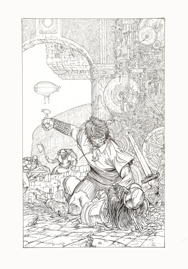 Roberto Ali "Hero of Alexandria", 2012 matita e china su cartoncino, 29,5 x 42 cm Originale di copertina per "Hero of Alexandria" edito dalla casa editrice americana Ape Entertainment nel 2012. Si allega la pubblicazione cartacea. Firmata.
