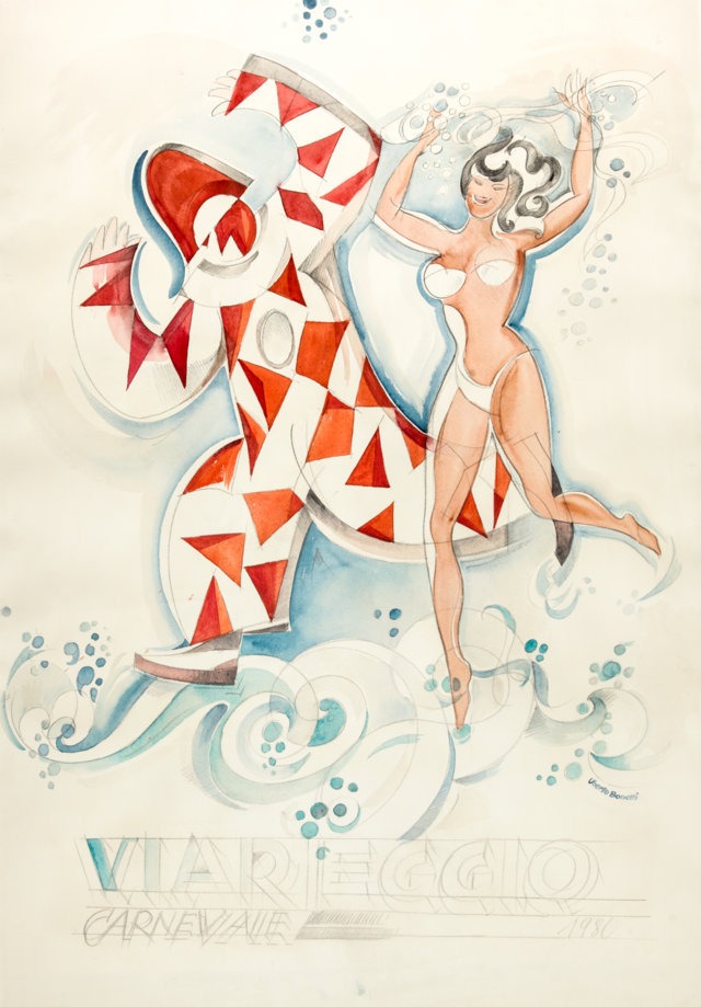 Uberto Bonetti "Carnevale di Viareggio '80", 1980 matita e tempera su cartoncino, 70 x 100 cm Bozzetto originale di grande formato per il manifesto ufficiale del Carnevale di Viareggio 1980. Forse il manifesto più famoso e iconografico del Carnevale di Viareggio che affidò al pittore futurista viareggino la creazione della sua effige, cioè la maschera Burlamacco, ideata appunto da Bonetti nel 1930 e qui affiancata dalla sua compagna Ondina. Firmato. In cornice.