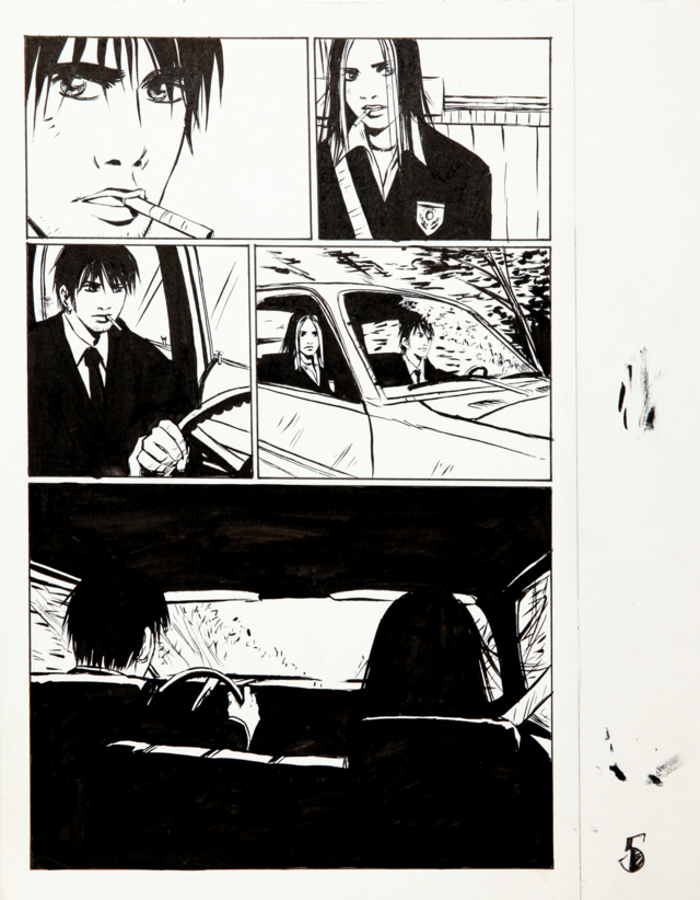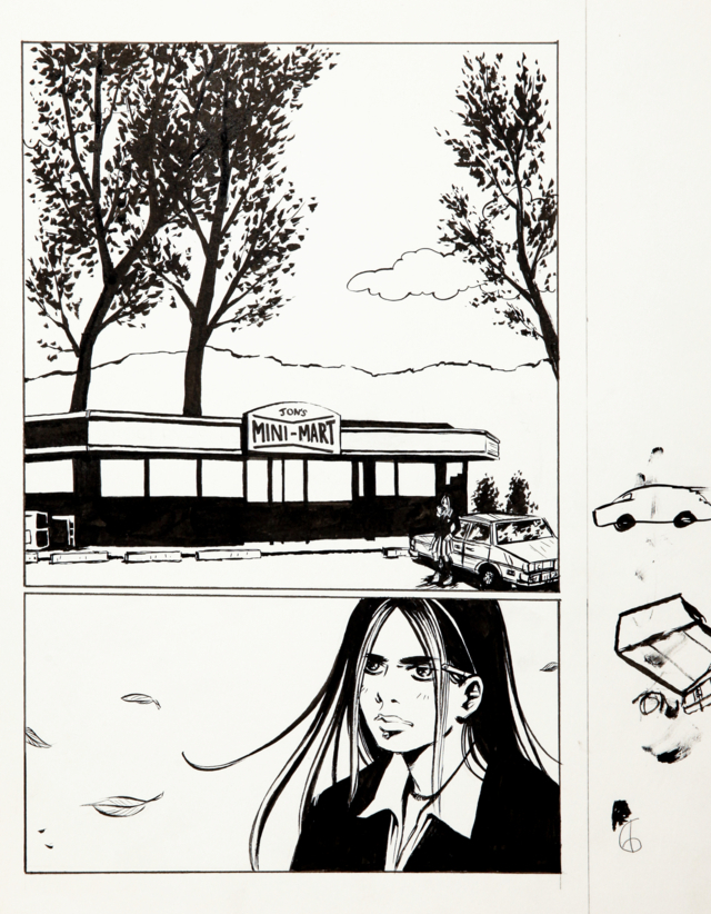Becky Cloonan "Demo - Bad Blood", 2005 matita e china su cartoncino, 28 x 35,5 cm Serie di due tavole originali consegutive per "Bad Blood" edite a pag. 5 e 6 sul terzo volume di "Demo" dalla AiT/Planet Lar nel 2005 e successivamente dalla Vertigo nel 2008. Testi di Brian Wood.