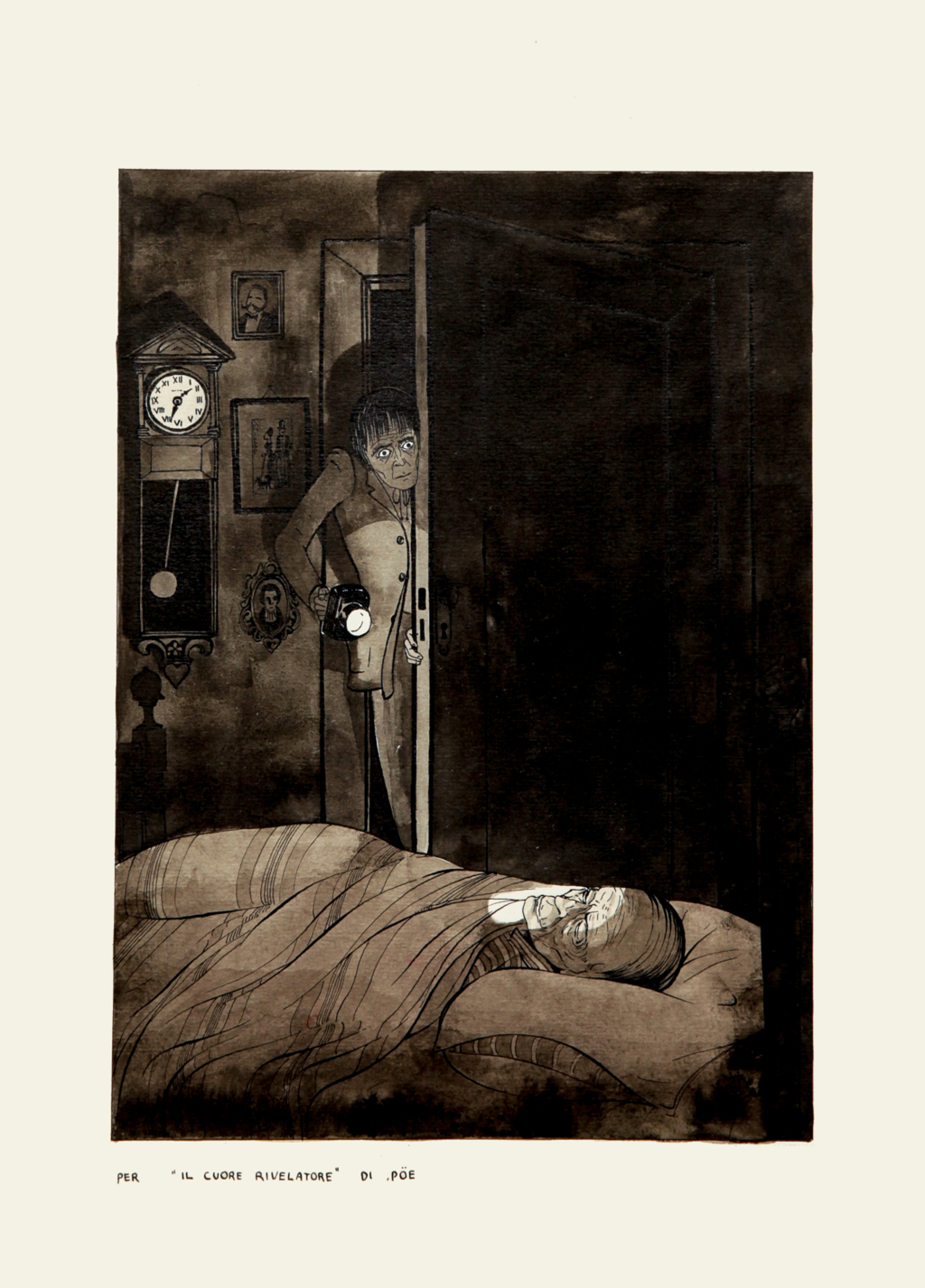 Guido Crepax "Il cuore rivelatore", 1951 china e acquerello su cartoncino, 24 x 32 cm Illustrazione originale inedita realizzata nel 1951 da Crepax per "Il cuore rivelatore" di Edgar Allan Poe. Opera di assoluta rarità facente parte di un ciclo relativo alle novelle di Poe eseguito da Crepax a soli 18 anni. L'attrazione del maestro milanese per il grottesco e l'orrido traspare già chiaramente in quest'opera giovanile di elevatisimo livello tecnico e compositivo, che lo porterà diciassette anni più tardi (1968) a rivisitare nuovamente le novelle di Poe sulla rivista Linus. Si allega all'opera il certificato di autenticità redatto dall'Archivio Crepax di Milano. Firmata e datata.