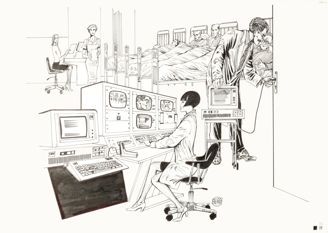 Guido Crepax "Boselli Sistemi", anni '80 matita e china su cartoncino, 70 x 50 cm Grande illustrazione pubblicitaria per la società Sistemi Boselli, specializzata in prodotti elettronici e computer, fondata nel 1987 dalla IBM Italia e Pirelli. Firmata.