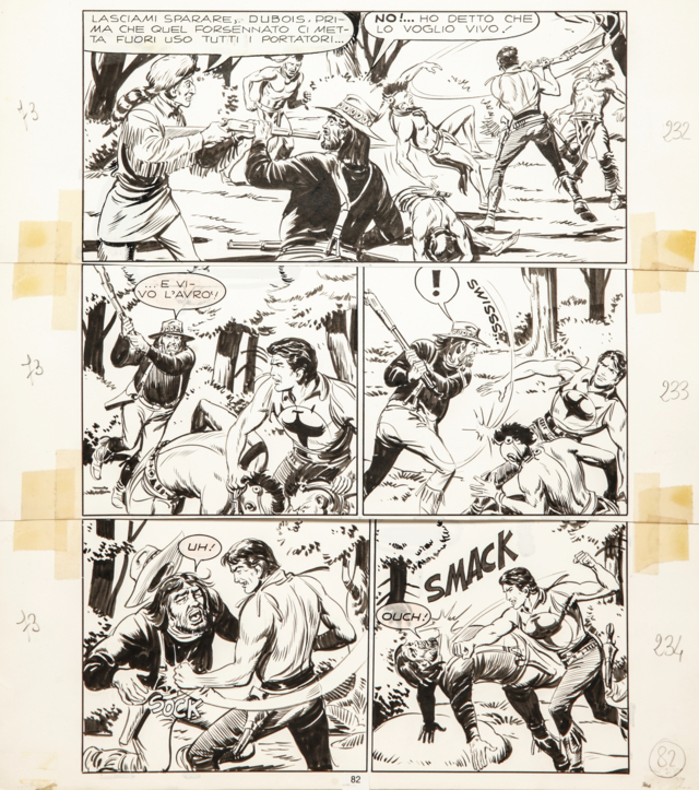 Gallieno Ferri "Zagor - Servizio segreto", 1970 matita e china su cartoncino, 33 x 38 cm Tavola originale composta da tre strisce per "Servizio segreto", edita su Zagor n.59 a pag.82 dalla Bonelli nel 1970.